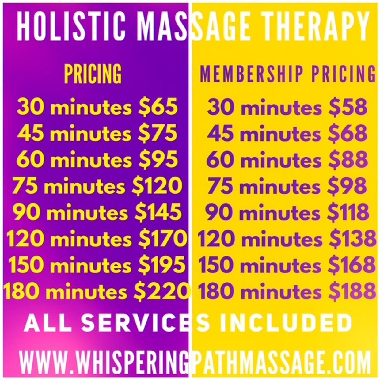The Customizable Monthly Membership meets your individual needs every month. Each month you choose how much time you want for your session. You get to choose from Massage, Polarity Therapy, Reiki, Yoga, Meditation, BioResonance Massage Therapy, Lomi Lomi Bodywork, Thai Bodywork and so much more. Choose 2 for a combo session. As long as the time of the session is long enough, you can choose as many services as you would like. There are so many combinations of sessions you can experience. All services are included and no add on fees. There is no contracts or auto draws out of your account. When you become a member, you will get membership pricing. To qualify for membership pricing, you must come for a session every month.